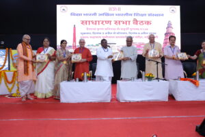 The inaugural session of the Annual General Meeting (AGM) 2026 of Vidya Bharati Akhil Bharatiya Shiksha Sansthan was held on April 3, 2026, with the ceremonial lighting of the lamp and invocation of Goddess Saraswati. The session was graced by the esteemed presence of Dr. Krishna Gopal Ji, Sah-Sarkaryavah of Rashtriya Swayamsevak Sangh, as the chief guest. He was joined on the dias by Shri Ravindra Kanhere Ji (All India President), Shri Deshraj Ji (General Secretary), Shri Govind Ji Mahant (Organising Secretary), and Shri Rohit Vaswani Ji (Treasurer). Addressing the gathering, Dr. Krishna Gopal Ji emphasized that Vidya Bharati continues to expand its role as a strong educational organization, rooted in national consciousness and a spiritual outlook. Referring to the principle “Ekam Sat Vipra Bahudha Vadanti”, he highlighted India’s cultural strength of unity in diversity. He stated that the purpose of education is not merely the dissemination of knowledge, but the development of a sense of national commitment, the establishment of spiritual values, and a holistic outlook towards life among students. Vidya Bharati, he said, is actively working towards achieving this harmonious integration. Dr. Krishna Gopal Ji stressed three key dimensions of education: national consciousness, understanding of spiritual fundamentals, and the nurturing of value-based students. He observed that increasing self-centeredness and materialistic tendencies in contemporary society are leading to intolerance, and that the solution lies in harmonizing nationalism with spirituality. Highlighting the impact of modern technological developments, he spoke about Artificial Intelligence (AI), stating that while technology is useful, it cannot replace human sensitivity, creativity, and values. Therefore, preserving human values within education is essential. He further emphasized that along with worldly education, imparting a spiritual perspective to every student is necessary to enable them to lead purposeful and value-oriented lives. He noted that the work of Vidya Bharati is an expanded manifestation of the foundational ideas of Dr. Hedgewar and is playing a significant role in nation-building. During the session, Shradhanjali was paid to departed inspiring personalities, and a framework for four days of deliberations for the coming year was presented. On this occasion, a ‘Smarika’ (Commemorative Publication) based on the theme “Saptashakti Sangam” was ceremonially released in the presence of Dr. Madhu Savji , Sadhana Bhandari Ji, Rajshri Vaidya Ji, and Avneesh Bhatnagar Ji.