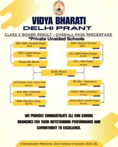 Vidya Bharati, Delhi Prant, an educational organization run with the support of society, has achieved a historic milestone in the Class 10 CBSE Board results for the academic session 2025–26.Dr. Satish Maheshwari, Prant General Secretary, informed that the overall result of 12 unaided private schools in the Prant stood at an impressive 98.99Out of a total of 986 students in these schools, 78% scored above 60% marks, while 60 students scored above 90%, reflecting excellent academic performance. Area-wise, schools in Punjabi Bagh, Rajouri Garden, and Lajpat Nagar achieved a perfect 100% result. Other areas also recorded strong results, including Nehru Nagar (99.41%), Rajgarh Colony (99%) Hari Nagar (98.99%), Vasant Vihar (98.70%), Mehrauli (98.33%), Sultanpuri (98.65%), Janakpuri (97.44%), Paschim Vihar (96.77%), and Gandhi Nagar (96.55%).In addition, 4 government-aided schools recorded an overall result of 93.40%. Out of 515 students, 141 students scored above 60%, while 6 students scored above 85%. Notable area-wise performances include Shankar Nagar (97.63%), Gandhi Nagar (98.15%), Shankar Nagar No. 2 (94.02%), and Sultanpuri (84.21%).Dr. Maheshwari also shared that all Vidya Bharati schools in Delhi Prant operate under three major committees—Samarth Shiksha Samiti, Hindu Shiksha Samiti, and Hindu Shiksha Samiti (Nayas). Their coordinated efforts ensure quality education and strong organizational support.The success is credited to a well-structured and student-focused academic system. Special mentoring is provided to meritorious students, while teachers personally guide weaker students by closely supporting them. Additional subject-wise classes are also conducted for students in the 60–75% range. Due to these dedicated efforts, not a single student failed in any school across the Delhi Prant.Vidya Bharati’s education system goes beyond academics. It equally focuses on values, patriotism, and character building. Most students come from middle and lower-income families, yet they achieve excellent results through hard work and proper guidance.This outstanding result is not only proof of academic excellence but also shows that with dedicated efforts, proper planning, and value-based education, every student can reach the highest level of success.